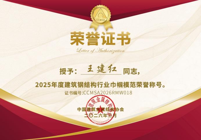 2026年3月,中国建筑金属结构协会开展了2025年度建筑钢结构行业巾帼模范评选活动。渤海船舶职业学院教师王建红荣获“2025年度建筑钢结构行业巾帼模范”荣誉称号。